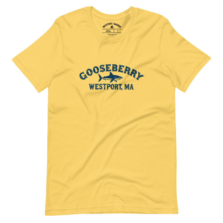 The Gooseberry Shark – Light Tee 3 is a laid-back, high-impact tribute to the raw beauty of Gooseberry Island—a New England gem tucked along the coast of Westport, Massachusetts. Known for its windswept paths, serene seascapes, and uninterrupted views of the Atlantic, Gooseberry draws in nature lovers, artists, and explorers. But beneath those tranquil tides lurks a thrilling twist: these waters are also known for Great White shark activity, making this tee a stylish nod to one of nature’s fiercest wonders.